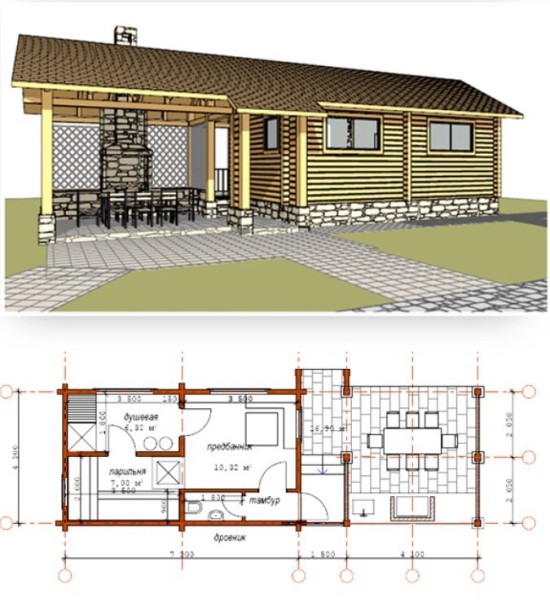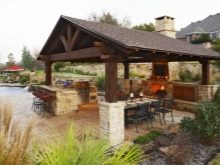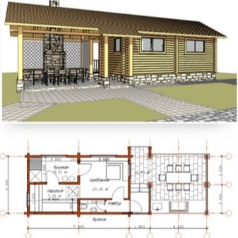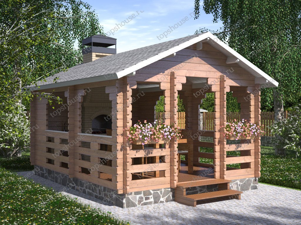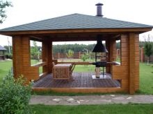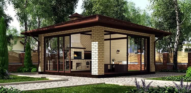Ein echtes rechteckiges Mini-Haus kann aus Holz gebaut werden, in dem sich eine Art halboffene Veranda mit einem Ofen befindet, Tische oder Stühle, sowie andere Möbel für die Erholung, in einem geschlossenen Teil des Gebäudes mit installierten Fenstern und einer Eingangstür. Über diesen Quadraten sollte ein Bedachungsmaterial gelegt werden, und die Basis der Struktur sollte aus Ziegeln oder Stein bestehen. Am Eingang des Pavillons können Sie einen kleinen Schuppen vom Dach machen - dadurch erhalten Sie einen großartigen Ort zum Entspannen, der einem scheinbar vollwertigen, behaglichen Zuhause ähnelt.