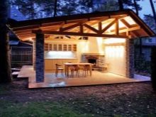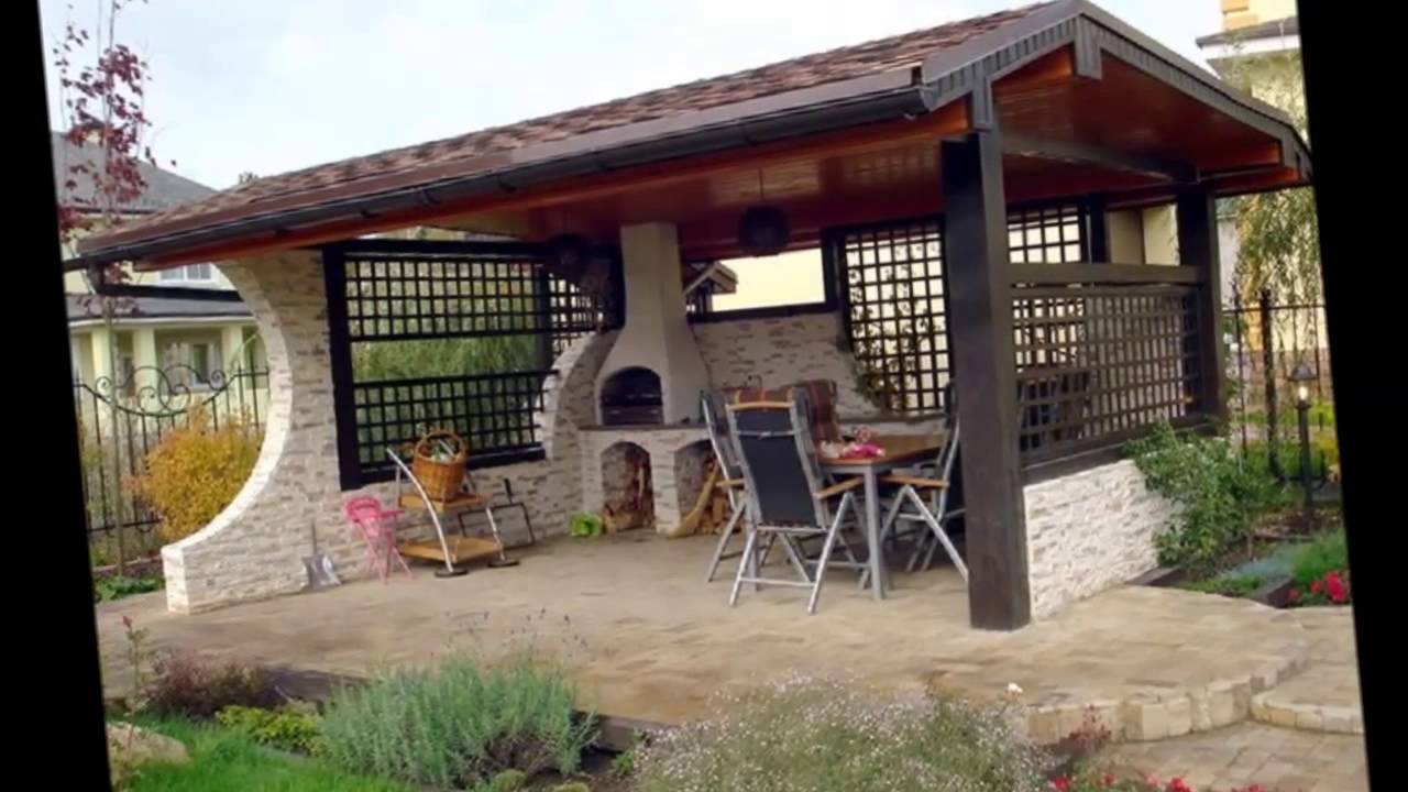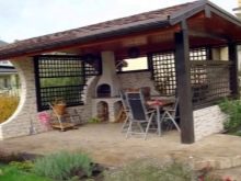 Eine unkomplizierte Option wäre ein halboffenes Laubenprojekt mit Giebeldach und geschlossener Rückwand. Der untere Teil einer solchen Struktur kann mit Ziegeln oder Mauerwerk verziert werden - auf dieser Grundlage wird die Struktur sicherer und stärker gehalten. Der Zugang zum Pavillon sollte von der Seite her erfolgen, die sich zwischen den Durchgängen befindet (wie offene Fenster). Innerhalb einer solchen Struktur lohnt es sich, einen Ofen oder ein Kohlenbecken einzurichten, sowie einen Kamin zu installieren. Diese Außenstruktur wird ordentlich und diskret aussehen.