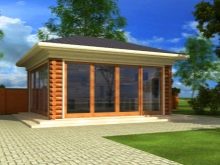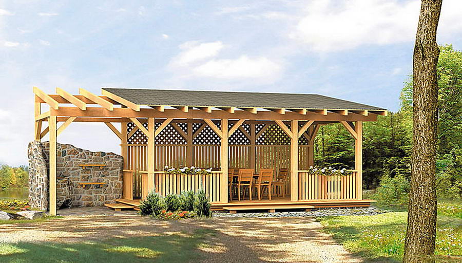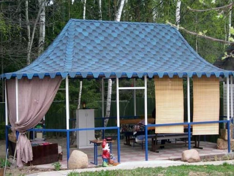 - Pavillon Eine solche Struktur ist ein viereckiger Pavillon mit einem schrägen Dach. In der Regel werden Pavillons so dicht wie möglich an der Terrasse oder dem Haus selbst auf der Baustelle installiert.