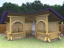 Oft sind die Wände der Lauben mit schönen Holzbalken ergänzt.Laut Fachleuten ist bei der Herstellung solcher Teile nichts kompliziert. Sie müssen nur viele dünne Schienen mit der gleichen Dicke schneiden und dann nageln Sie sie in einem Winkel eingerückt.