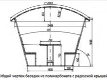 Das gewölbte Dach sieht nicht weniger originell und frisch aus. Es kann auf einer runden Welle montiert werden. Je nach Neigungswinkel kann sich ein Helm oder ein kegelförmiges Dach auf eine solche Struktur stellen.