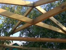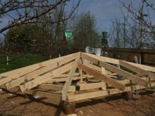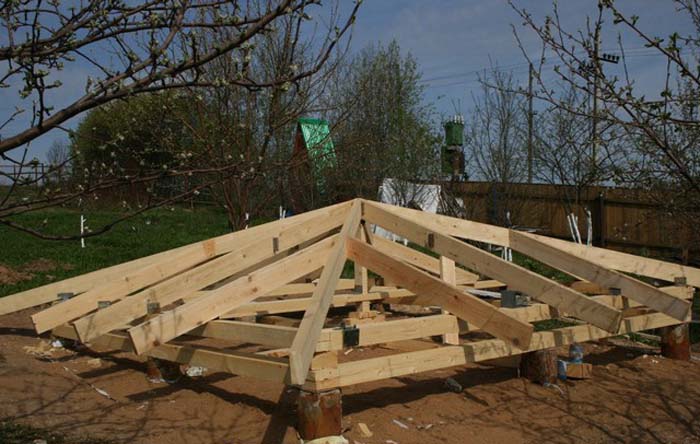 Danach wird der Rahmen des Daches vorbereitet - zuerst wird ein horizontales Kreuz gemacht, das normalerweise aus 100x40 mm Brettern besteht. Von ihnen auf dem Boden sollte Diagonalbündel gesammelt werden, in der Mitte des Brettes nach dem Prinzip "Halbbaum" zu verbinden.
