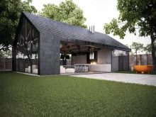 Ein ähnliches Design kann entworfen werden, indem die Sommerküche durch eine gemütliche Ecke in unregelmäßiger Form mit einem Tischtennistisch oder Sesseln ersetzt wird, die auf Wunsch der Besitzer geöffnet bleiben können. Diese Verlängerung sollte direkt zur Eingangsglastür des Dorns der gleichen unregelmäßigen Form führen, beispielsweise L-förmige Ausführung.