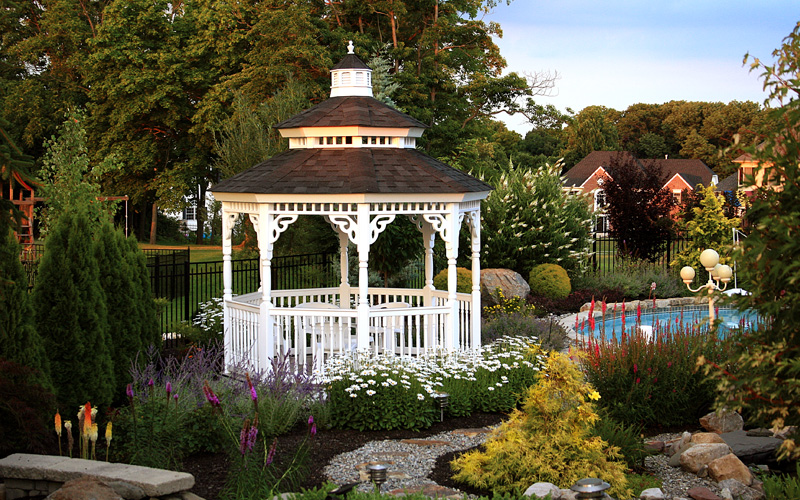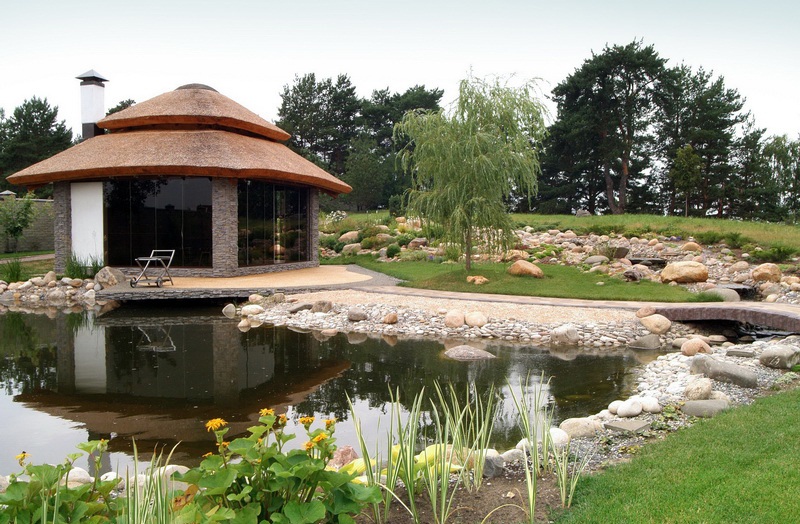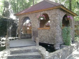 Oft ergänzen Pavillons auf der Website die verschiedenen Elemente des Dekors. Dies können Blumenbepflanzungen, die umgebende Struktur, Steinwege um den Pavillon oder künstliche Reservoirs sein. In einem einzigen Ensemble wirken all diese Details sehr harmonisch und attraktiv.