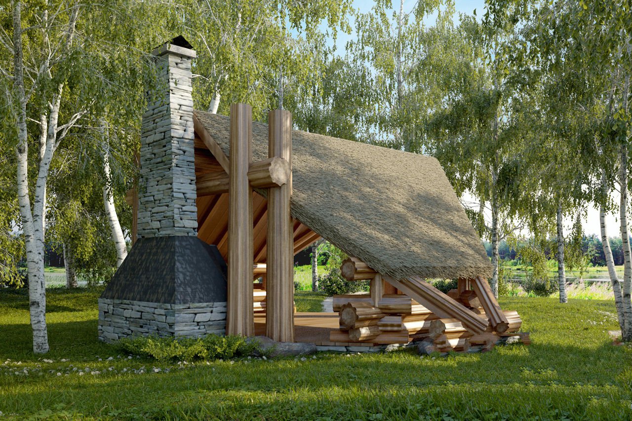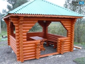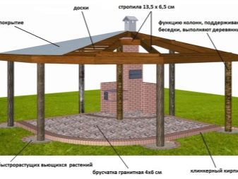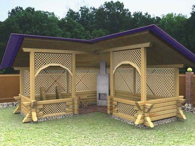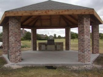 Geöffnet kann nicht nur rechteckiges, sondern auch eckiges Design sein. Wenn Sie zum Beispiel einen Pavillon bauen, können Sie sich auf ein Projekt verlassen, das eine eckige Struktur ohne Wände zeigt, aber mit einem Rahmen aus 7 dicken Holzgestellen. Auf den Stützen kann man eine Sparrenunterlage unter das Dach legen, und der Boden in einer solchen Laube wird interessant sein, wenn man ihn mit Steinen oder Pflastersteinen auslegt.In der Ecke dieses Entwurfs findet seinen Platz hoher Ofen mit einem Schornstein. Nach Belieben kann diese Struktur Mantelbretter sein.