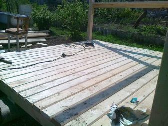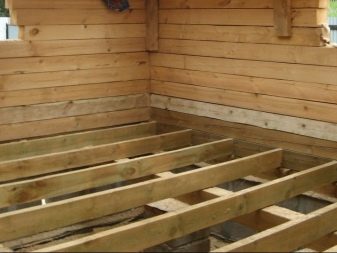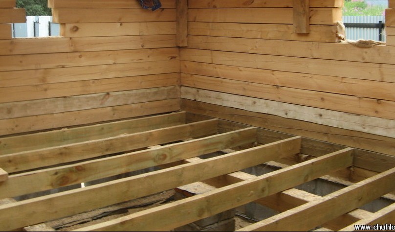 Nach der sicheren Befestigung sollte der Baumstamm bis zur Verlegung des Fußbodens verlegt werden. In diesem Fall empfiehlt es sich, Platten mit einer Stärke von 20-25 mm zu verwenden. Vergessen Sie nicht, die Lüftungslücken zu verlassen und den Boden zu verlegen. Danach sollte das Holz mit Antiseptikum behandelt werden.