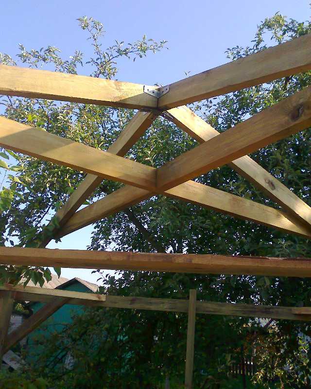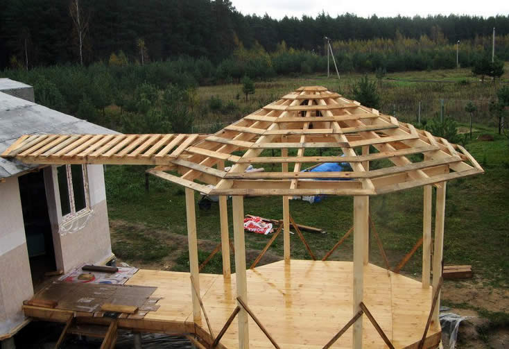 Rechteckige Pavillons sehen gut aus, wenn sie ein ordentliches Giebeldach haben. In diesem Fall ist es zulässig, geneigte oder fallende Sparren zu verwenden.