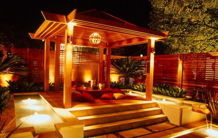 Sie können nicht nur tagsüber, sondern auch abends oder nachts im Pavillon entspannen. Um dies zu tun, werden solche Designs durch verschiedene Beleuchtungseinrichtungen ergänzt - es können Wand-, Pendel- und Stehlampen sein.