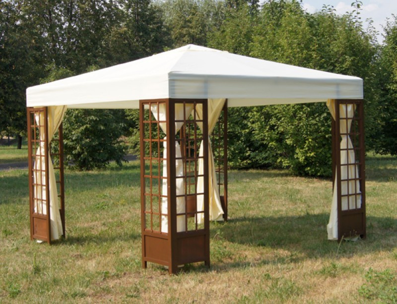 Dimensionen Pavillons sind sehr unterschiedlich.Meistens gibt es jedoch in den Bereichen Strukturen von Standardgrößen (angegeben in Metern): 2x2; 2x2,5; 3x3; 3x4; 4x4; 5x5; 6x4; 6x6.