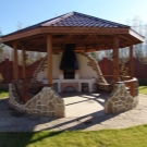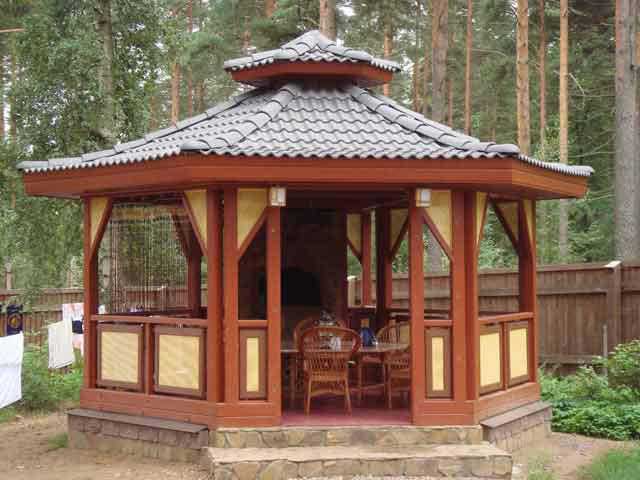 - Die einfachste Möglichkeit ist es, einen Pavillon aus gefällten Ästen und Baumstämmen zu bauen. Grobe Konstruktion fügt sich organisch in das Design jeder Baustelle ein. Holz sollte von Rinde gereinigt werden, mit antiseptischen und feuerfesten Verbindungen behandelt und dann lackiert werden.
