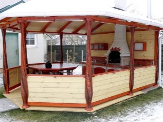 - Offene Pavillons sind ein Schuppen mit einem Kohlenbecken installiert - sie sind nur für die warmen Tage des Frühlings, Sommer und Herbst bestimmt. Geschlossene Arten erlauben es Ihnen, zu jeder Jahreszeit außerhalb des Hauses zu entspannen, aber die halb geöffneten Gartenlauben sind eine Art "goldenes Mittel": Im Sommer sind sie nicht heiß und im Winter ist der Ofen durch drei Wände vor dem Wetter geschützt. Wenn gewünscht, können Sie eine halb offene Art von Laube mit einer transformierenden Wand konstruieren.