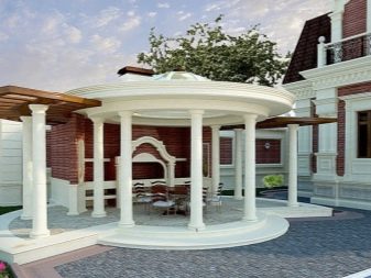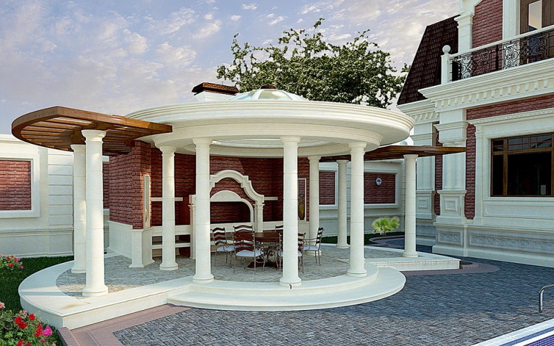 - Klassische Pavillons ziehen Aufmerksamkeit auf Klarheit der Formen und prägnantes Design. Holz und Marmor werden als Dekoration verwendet und das Interieur ist in sanften Pastelltönen gehalten. Es ist erlaubt, schmiedeeiserne Elemente, geschwungene Gesimse und Blumentöpfe mit frischen Blumen zu schmücken.