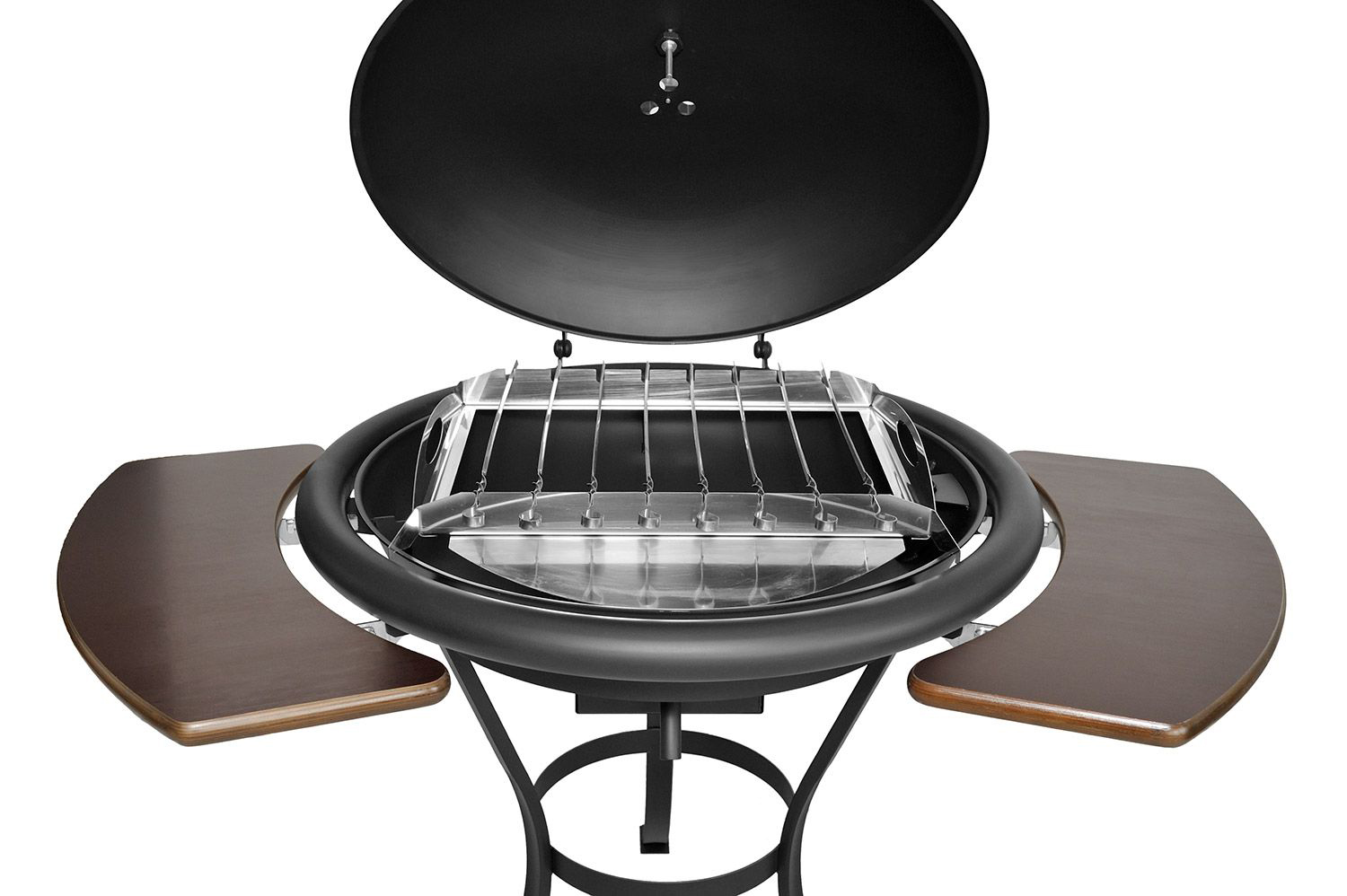- Mobiler leichter Grill mit einem speziellen Deckel ermöglicht das Garen von Speisen von oben und unten. Bei Bedarf kann es von Ort zu Ort bewegt werden, was eine effiziente Raumnutzung ermöglicht.