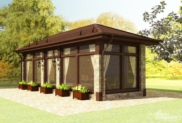 - Wenn die Pläne für den Bau von schweren Gesamt-Design, sollten Sie über die Anordnung des Fundaments, die Stärke der Verbindung Rahmenelemente denken. Es ist darauf zu achten, dass der Boden nicht rutschig und das Dach dauerhaft ist. Oft ist das Dach mit einer Metallfliese, Schiefer, evroshiferom oder professionellem Boden bedeckt.