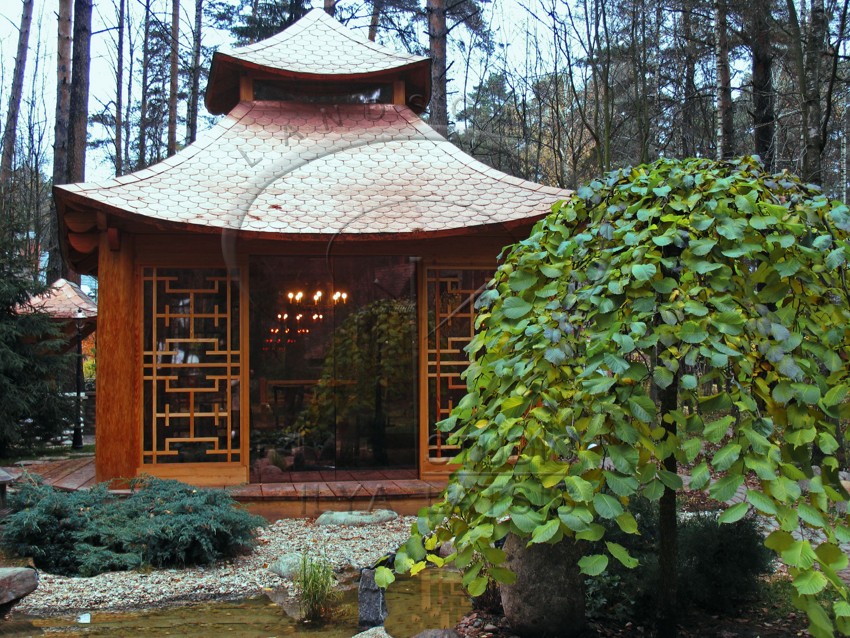 - Eine kleine Anhöhe über einem künstlichen Reservoir ist eine ideale Position für eine Laube in einem orientalischen Stil. Oft ist es in Form einer chinesischen Pagode oder einer japanischen Rotunde gestaltet. Um den Stil zu betonen, lohnt es sich, das mehrstöckige Dach mit Figuren auszurüsten, dessen Ecken nach oben gerichtet sind.Die Dekoration mit natürlichen Materialien, einschließlich Bambus und Zuckerrohr, ist willkommen. Der Innenraum sollte in ruhigen Farben gestaltet und mit Reispapier, Matten, Miniaturmöbeln und Stehlampen dekoriert sein.