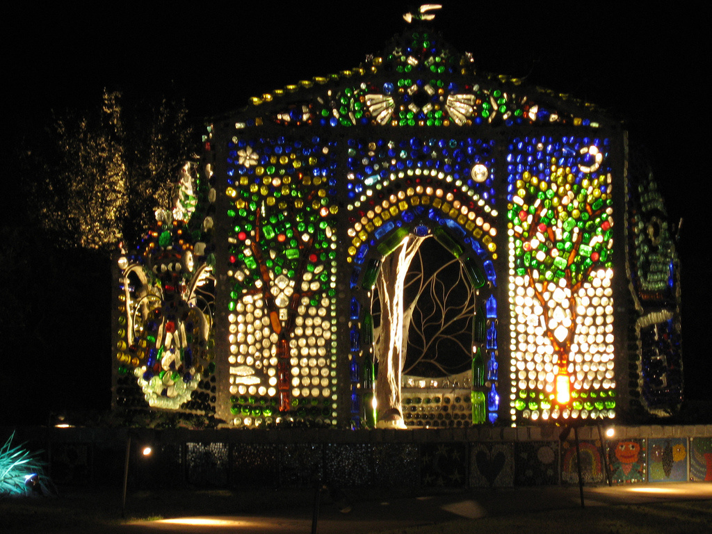 - Grüne, blaue und braune Flaschen sind in Reihen angeordnet, die mit einer speziellen Lösung zusammengehalten werden. Solche Wände lassen nicht nur die Sonne durch, sondern leuchten auch schön. Es ist wichtig, dass eine solche Laube im Schatten steht, sonst wird es unangenehm sein.