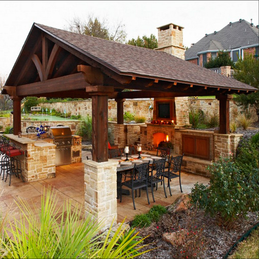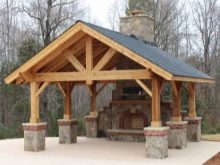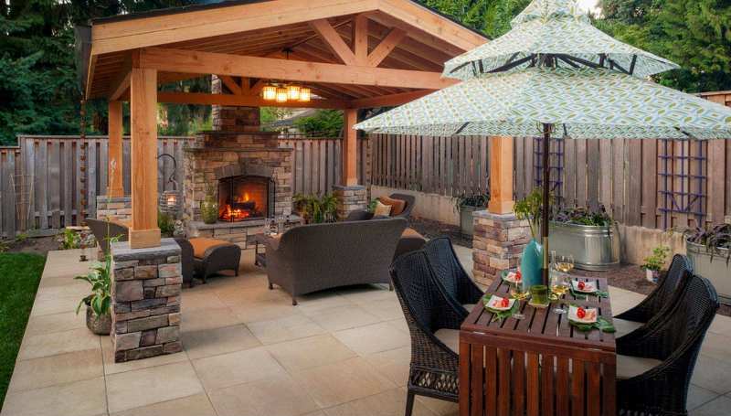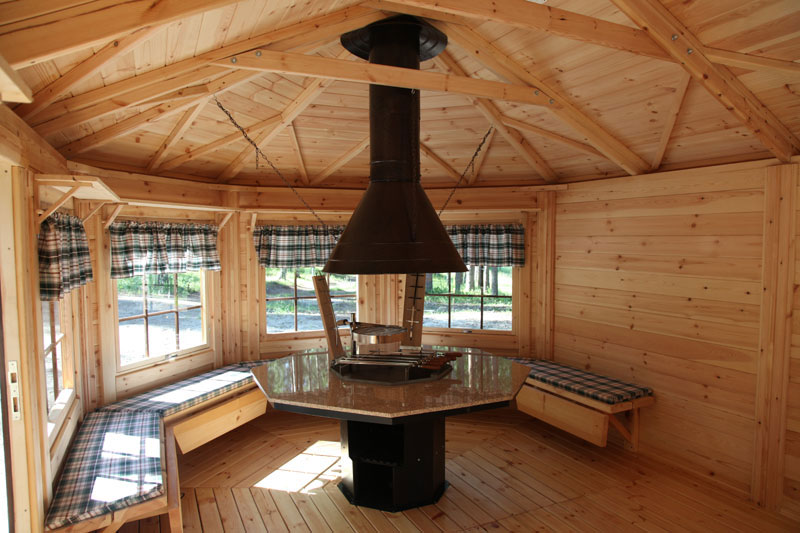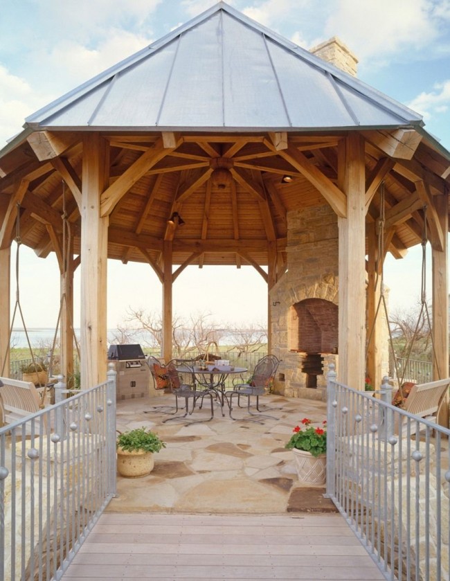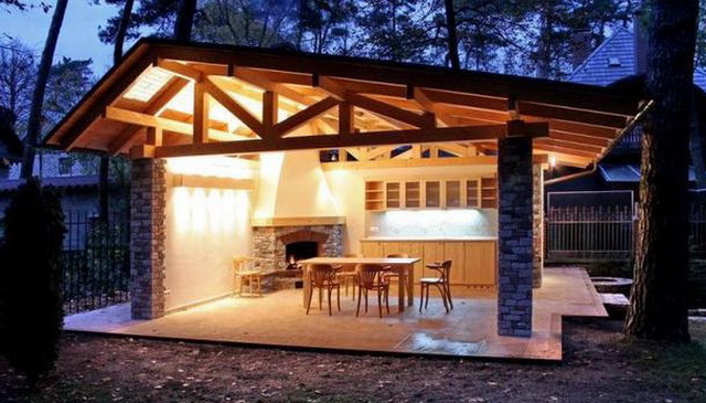 Ein mit einem Herd ausgestatteter Pavillon kann von beschränkter Größe sein und eine kleine Familie ansprechen. Unter dem Dach ist ein Esstisch aufgestellt, um den sich Haushalte bequem sammeln können. Das ursprüngliche Design der Decke mit einem Volumen, das durch Holzbalken bestimmt wird, gibt ein ungewöhnliches Design, und auf Kosten eines großen mit Steinblöcken gesäumten Bereichs gibt es zusätzlichen Platz für Gäste.