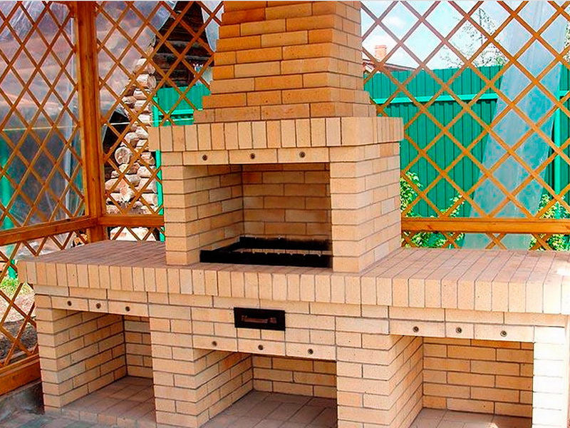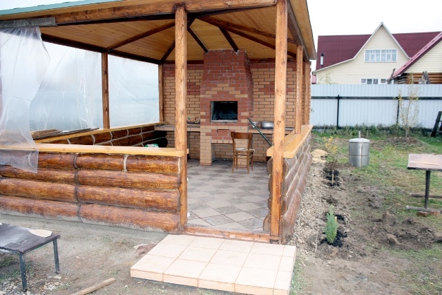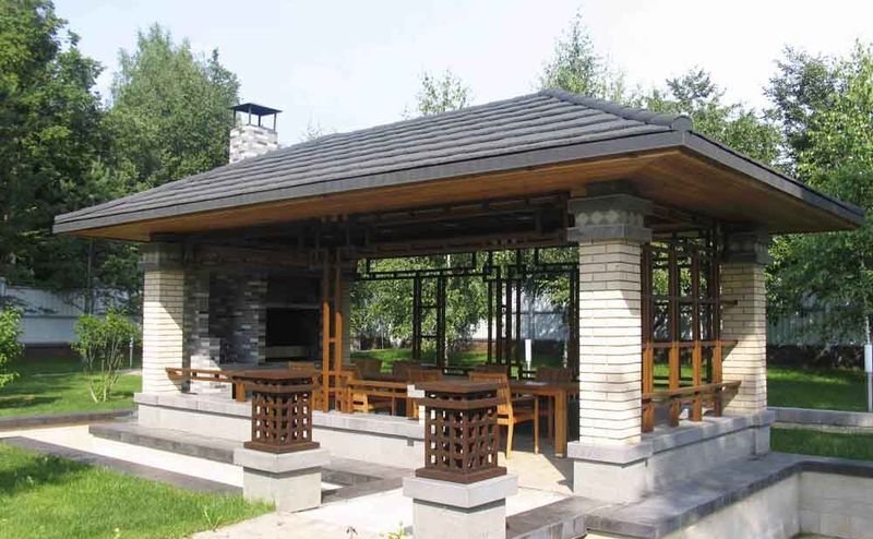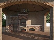 Eine gute Option für den Bau mit einem Ofen ist die Verwendung von Ziegeln.Aber wir müssen bedenken, dass solch ein beeindruckender Pavillon auf einem Grundstück mit einer minimalen Fläche nicht ganz angemessen aussehen wird. Aber eine solche Struktur kann, wenn sie richtig gebaut ist, sehr lange ohne besondere Sorgfalt dienen.