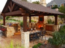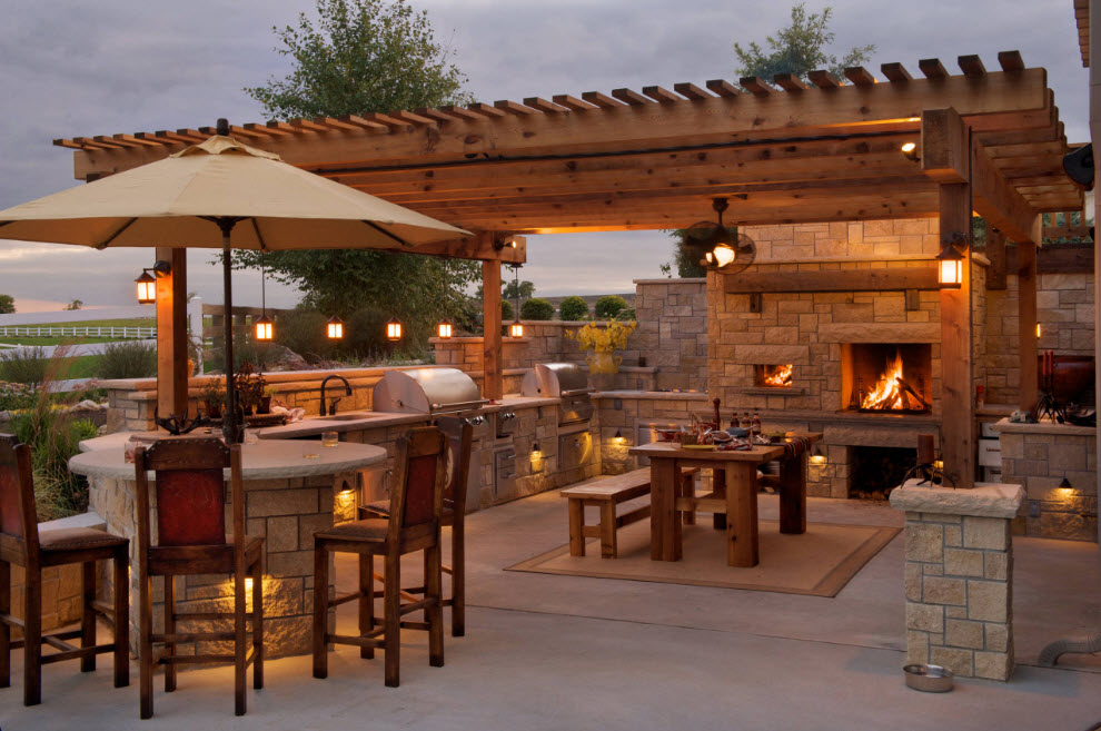 Ein offener Pavillon mit Giebeldach ist interessant für die Gestaltung des Kaminofens und der Kochzone, die im Sinne eines kantigen Küchensets gestaltet wurde. Strukturiertes Mauerwerk verleiht dem Pavillon einen besonderen architektonischen Wert. Diese Sommerküche ist bequem für die Gastgeberin und ihre Gäste.