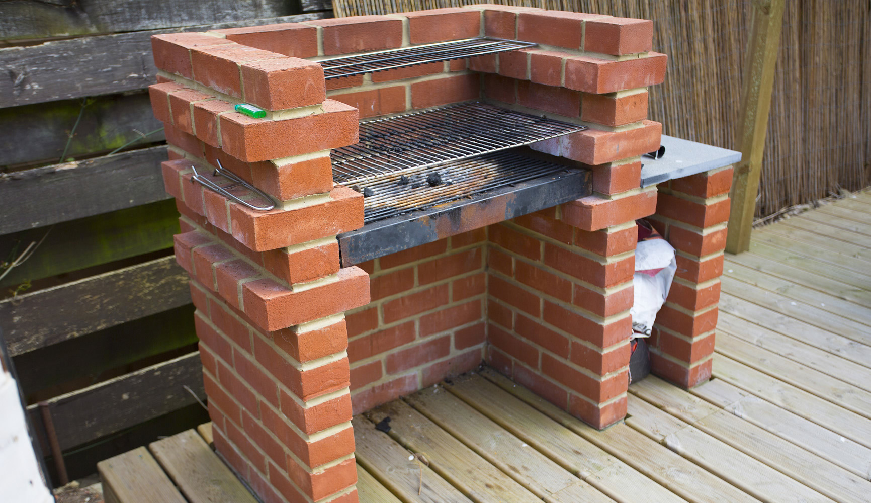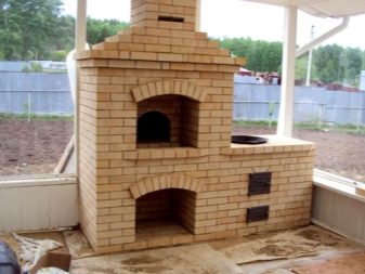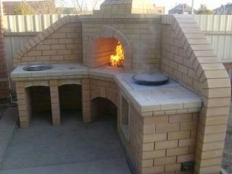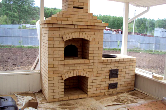 Wenn ein Bereich gewählt wird, in dem ein Zaun aus nicht brennbarem Material vorhanden ist, um die Welle aufzunehmen, kann diese Barriere als Gebäudewand mit einem Ofen verwendet werden. Mit diesem Ansatz wird der Bau billiger und der Platz auf der Website wird gespart. Pflasterziegel können als Fundament und Boden verwendet werden.