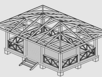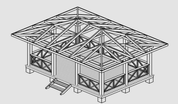 Wann immer es möglich ist, ist es besser, die meisten Arbeiten zur Dachmontage ohne Hochfahren durchzuführen. Die Enden der Sparrenbalken müssen in einem Winkel von 45 Grad geschnitten werden, auf der anderen Seite müssen Sie die Schlösser schneiden und die Elemente verbinden. Der fertige Rahmen wird auf den Stützen des Gebäudes montiert und verschraubt. Um ein Dach zu verkleiden, ist der einfachste Weg, Sperrholz oder Bretter zu verwenden. Um das Rohr sollte ein Loch vorgesehen werden. Der Schornstein selbst ist mit Asbestpappe verkleidet.