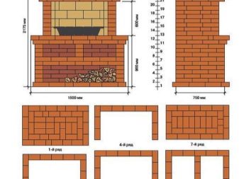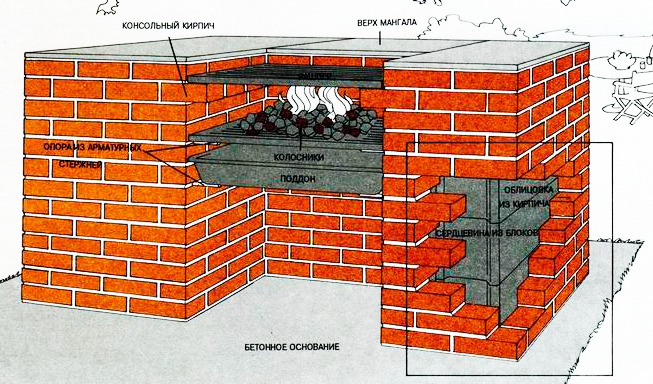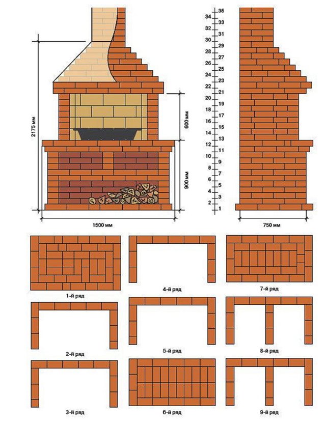 Wenn der Beton der Gründung gesetzt ist, können Sie mit dem Bau des Ofens beginnen. Stellen Sie zuerst einen Standpunkt dafür ein. Der Platz unter dem Stand kann zum Lagern von Brennholz genutzt werden. Ziegel sind in Reihen nach dem Schema gestapelt. Elemente auf dem Umfang werden die Basis sein. Dann müssen Sie den Ofen, der Kebabs kochen wird setzen. Dafür wird es genug Höhe von sieben Ziegeln geben.