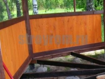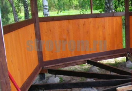 Wenn der Pavillon geöffnet ist, reicht die Konstruktion der Stützen aus. Dies sind parallele Balken, die an einem horizontalen Kabelbaum installiert sind. Um die Festigkeit zu gewährleisten, sind sie mit Querträgern verstärkt. In den Lücken zwischen den Racks sind Geländer.