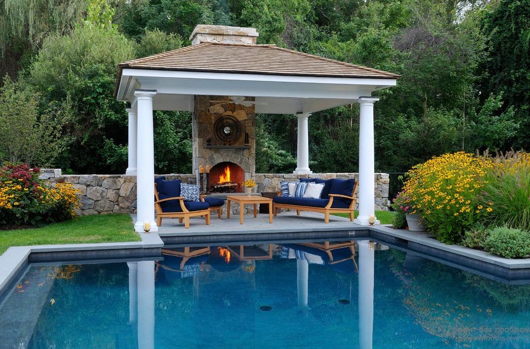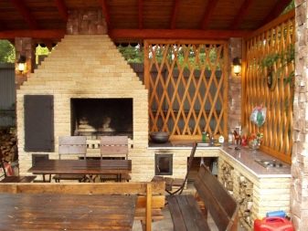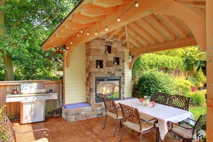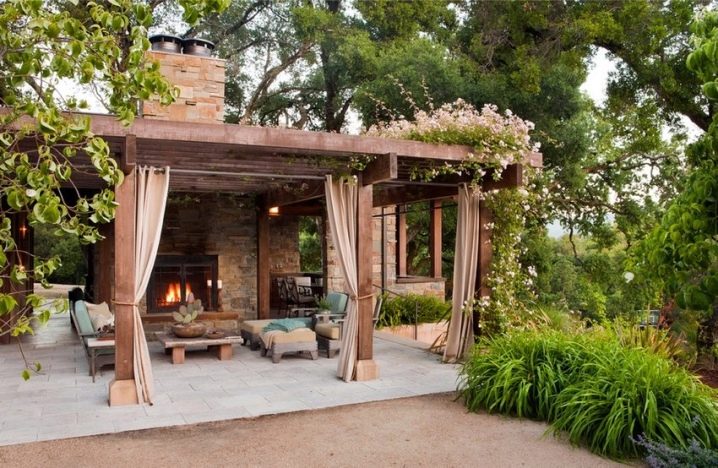 Ein halboffener Pavillon mit Kamin ist ein wunderbarer Ort für eine abendliche Erholung im Sommer. Die Kombination von Holz und Ziegel ermöglicht es Ihnen, ein Gleichgewicht zwischen Leichtigkeit und solider Konstruktion zu bewahren. Die Frage des Schutzes vor dem kalten Wind wird mit Hilfe von Vorhängen gelöst. Zusatz in Form von Kletterpflanzen ermöglicht es Ihnen, sich in der Gartenlaube von der Außenwelt zu fühlen, was wichtig ist, wenn Sie sich auf einen erholsamen Urlaub einstimmen möchten.