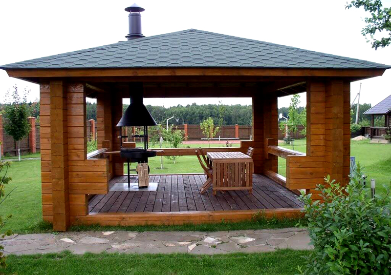 Das häufigste Material für ein Gartengebäude mit einem Ofen ist Holz. Solch eine Struktur sieht am organischsten gegen jede Landschaft aus. Aus finanzieller Sicht ist der Einsatz von Holz profitabler. Darüber hinaus ist es für viele Besitzer von Vorstadt-Immobilien nicht schwierig, unabhängig davon einen Pavillon zu bauen.