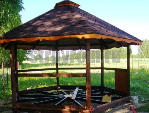 Bei der Anordnung des Bodens ist es notwendig, eine Isolationsschicht vorzusehen, die ihn vom Boden trennt. Ruberoid wird dafür verwendet. Wenn der Pavillon offen ist, sollte der Boden leicht geneigt verlegt werden, damit das Wasser bei Regen von der Baustelle ablaufen kann.
