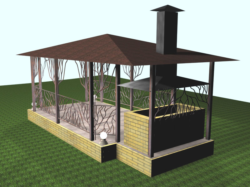 Wenn die Besitzer einen Pavillon brauchen, der nur an heißen Sommertagen benutzt werden kann, ist es gut, Metall für den Bau zu nehmen. Es kann sogar eine geschmiedete Konstruktion mit durchbrochenen Geländern und Eisenstreben sein, die das Vordach tragen. Sieh eine solche Struktur wäre sehr attraktiv. Gleichzeitig wird seine Konstruktion nicht viel Zeit in Anspruch nehmen, und das Gebäude wird während des Betriebs nicht aufleuchten, besonders wenn das Innere ein Minimum an Elementen enthält, die ausbrechen können.
