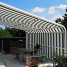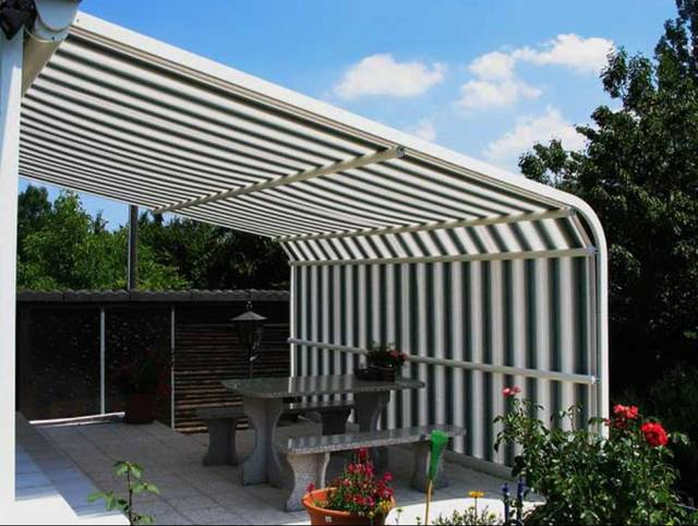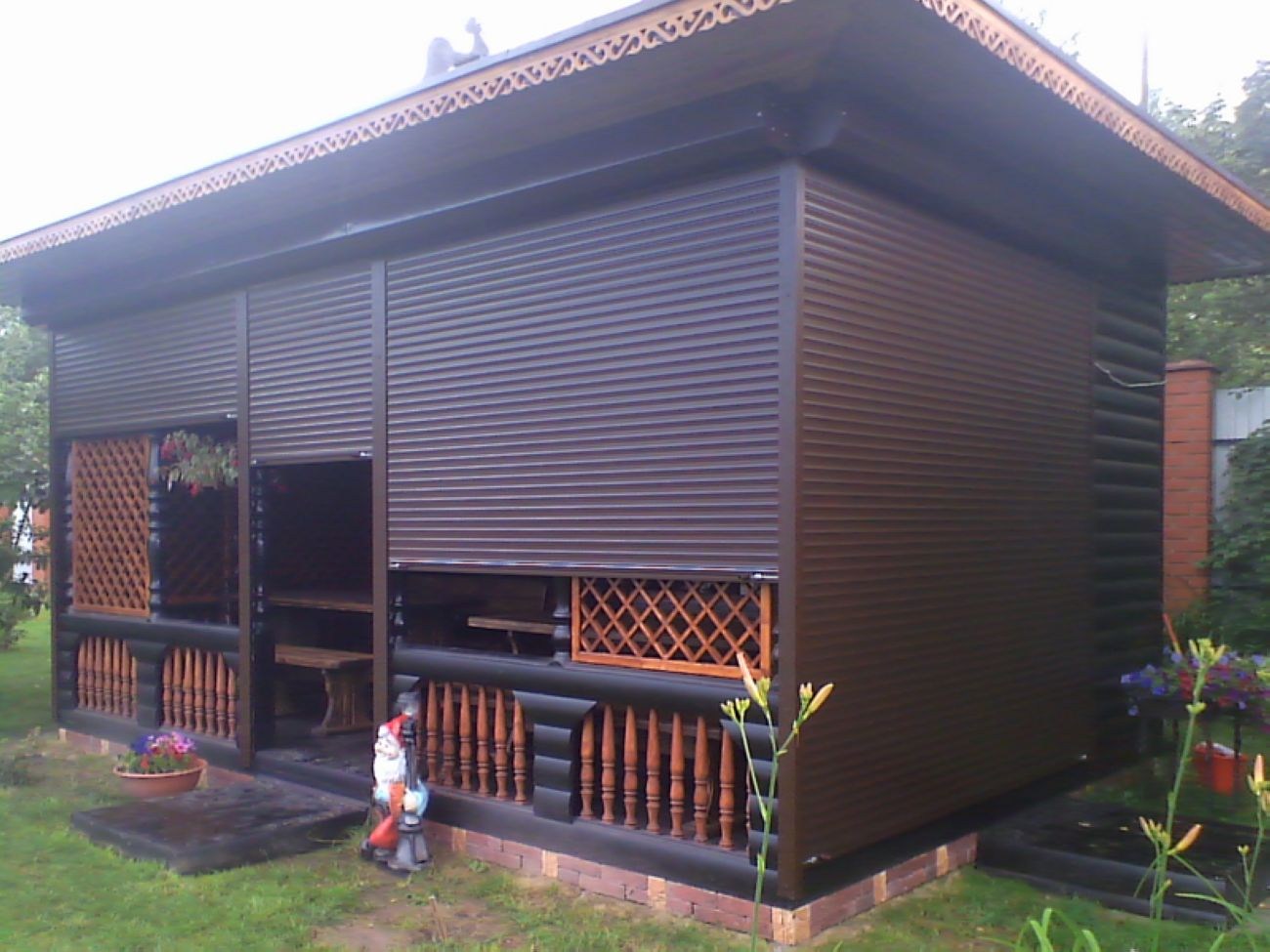 Sie können über die Anordnung der Freifläche mit Hilfe einer anderen Art von Markise nachdenken. Dies wird es ermöglichen, vor Sonne und Regen zu schützen, sowie den Bereich vor dem Eingang zum Pavillon auszustatten. Sie können sogar Stühle machen, eine Hängematte aufhängen, einen kleinen mobilen Tisch auf einen Laptop stellen. Bei Bedarf kann der Aufsatz aufgerollt werden, um ihn nicht zu zerbrechen.