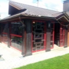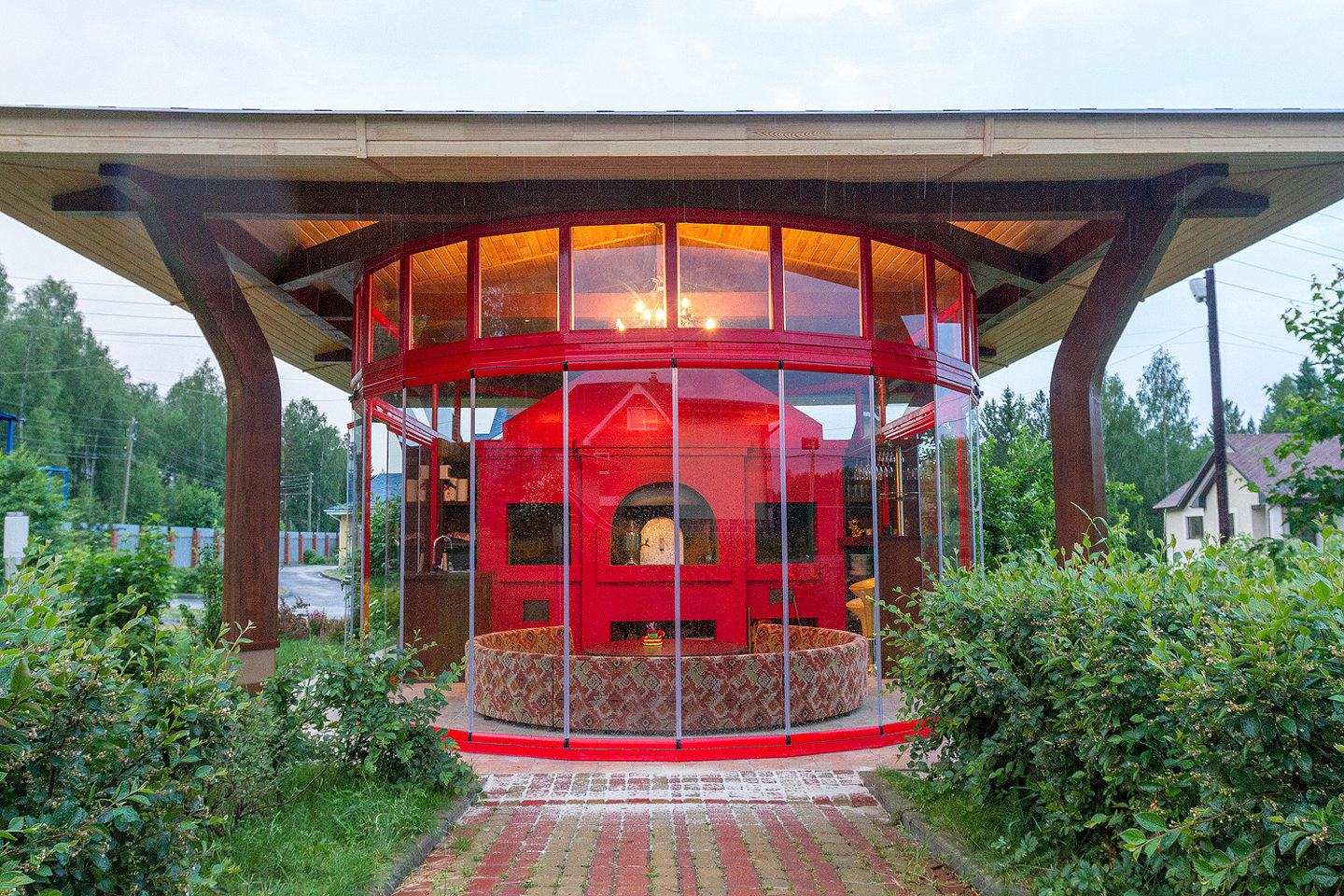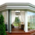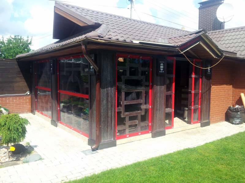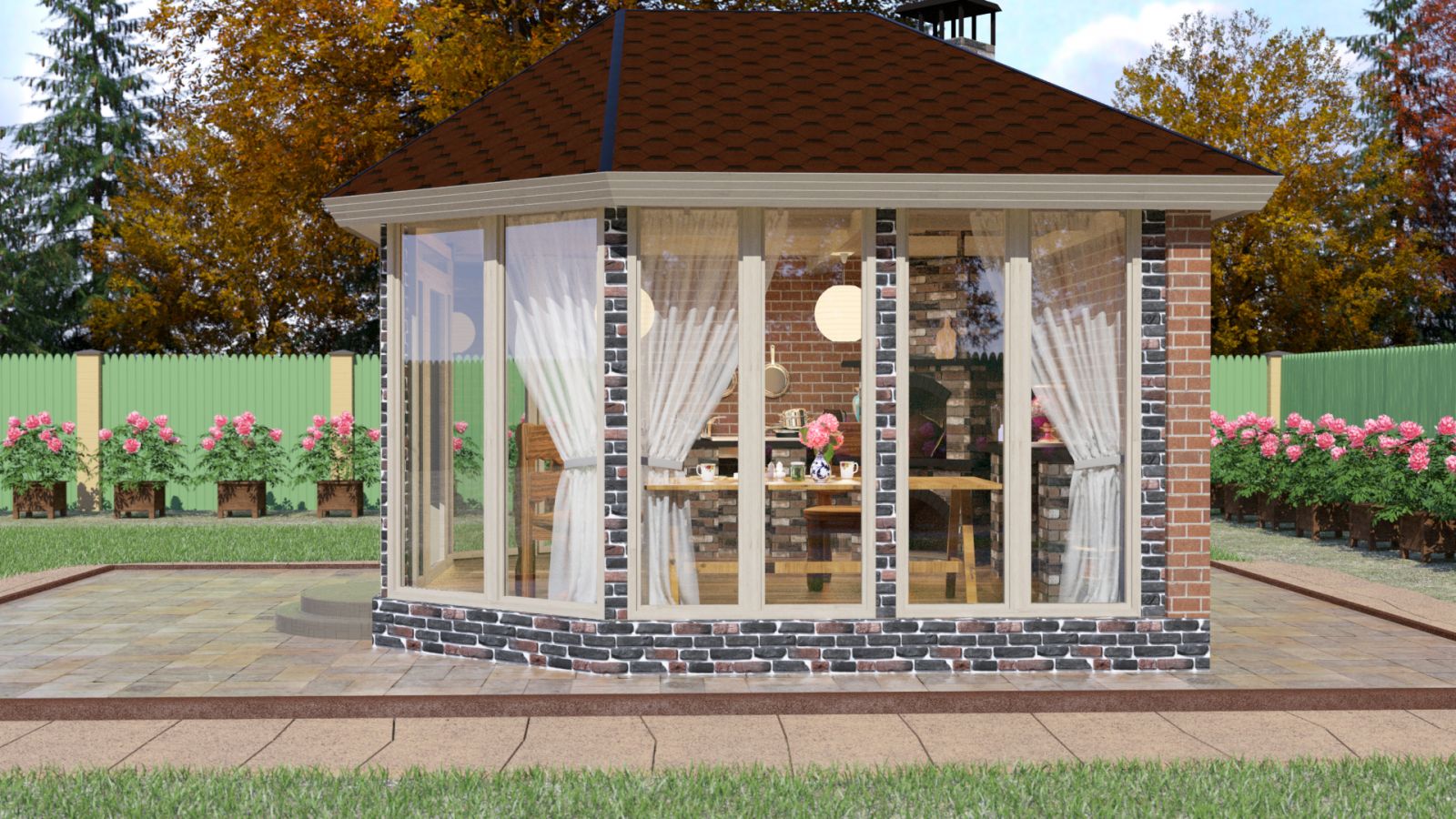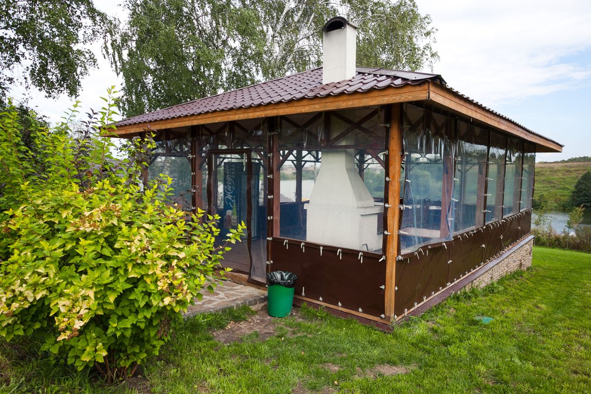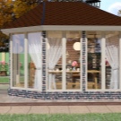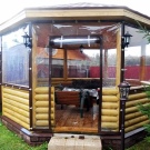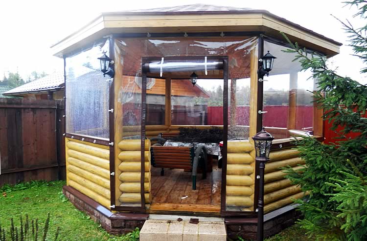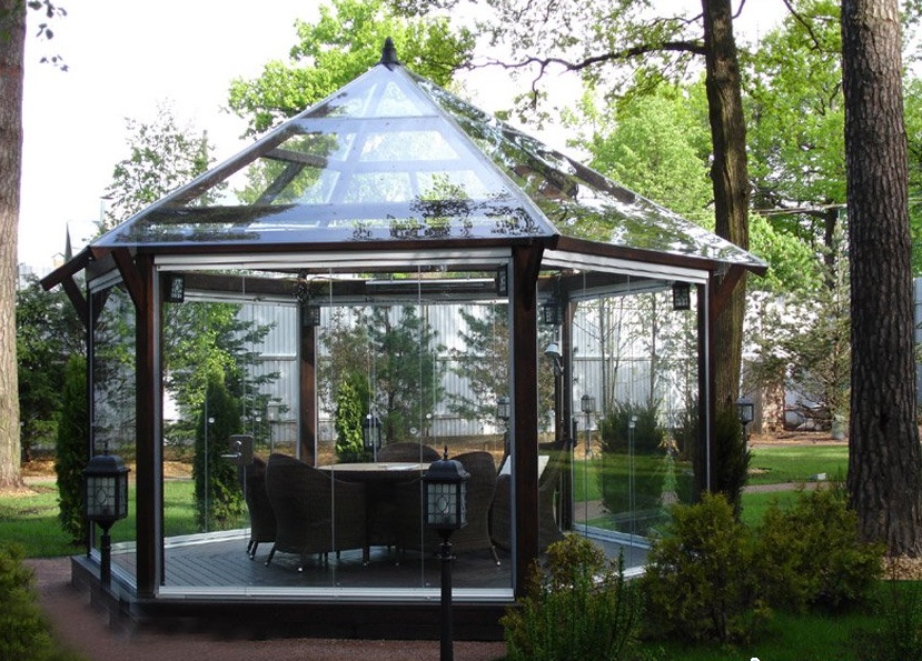 Um das Problem der Verstopfung im Inneren zu lösen, ist es möglich, einen gedeckten Typ mit Glasvorhängen zu entwerfen.. Natürlich sind solche Einrichtungen nicht warm, wie Pavillons aus Stein oder Ziegeln, aber sie eignen sich gut für warme Regionen. Zusätzlich ermöglicht das Öffnen einer Glasvorhangtür, falls erforderlich, ein Analog eines halbgeschlossenen Typs aus einem geschlossenen Dorn herzustellen. Dieser Pavillon wird hell sein, und Wenn Sie das Glas mit einer speziellen Folie überkleben, wird es vor Strahlung geschützt und vor neugierigen Blicken geschützt alles was drinnen passiert.Gleichzeitig ist der Film einzigartig: Von innen wird der Blick auf die Straße nicht begrenzt.
