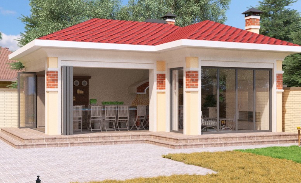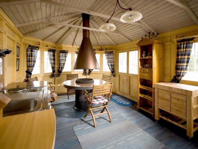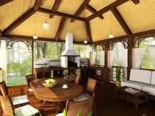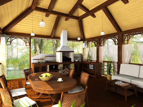 Wenn ein Pavillon im Sommer als Küche benutzt wird, ist es wichtig, sofort darüber nachzudenken, wie man Unbehagen vermeiden kann, da nicht jeder in der Nähe des Grills oder Ofens sein kann, während das Essen gekocht wird. Die Lösung für dieses Problem kann ungewöhnlich sein. Zum Beispiel kann ein Pavillon eine kleine Plattform in der Nähe des Eingangs haben. Im Sommer wird es eine ausgezeichnete Veranda sein und Sie können es mit beweglichen Plastikmöbeln ausstatten.