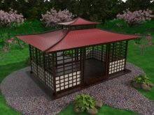 Im Inneren kann mit verschiedenen Materialien, einschließlich Futter, Bodenbelag und Pflasterplatten und Schienen, die von der Wahl des Designs Stil abhängt abgeschlossen werden. Abhängig von der Art des Materials und dem Konzept der Hauptstruktur, kann es in jedem der Zweige des Interieurs entworfen werden, sei es klassisch, modern, ethnisch oder eklektisch. Ein anschauliches Beispiel für einen solchen Pavillon ist eine Variante mit einer Nachbildung von Fanza, die sich in der Nähe eines Reservoirs befindet.. In diesem Fall ermöglicht Ihnen das Projekt, nicht nur eine funktionale und ästhetisch ansprechende Konstruktion mit einer bestimmten historischen Note auszuführen.