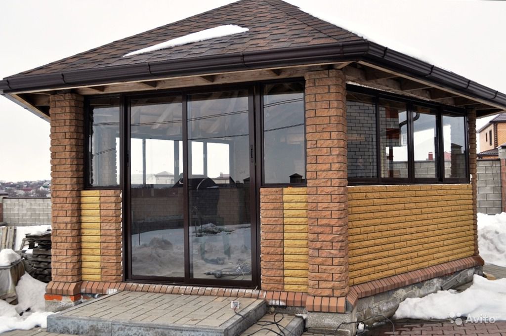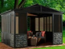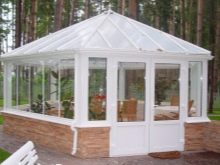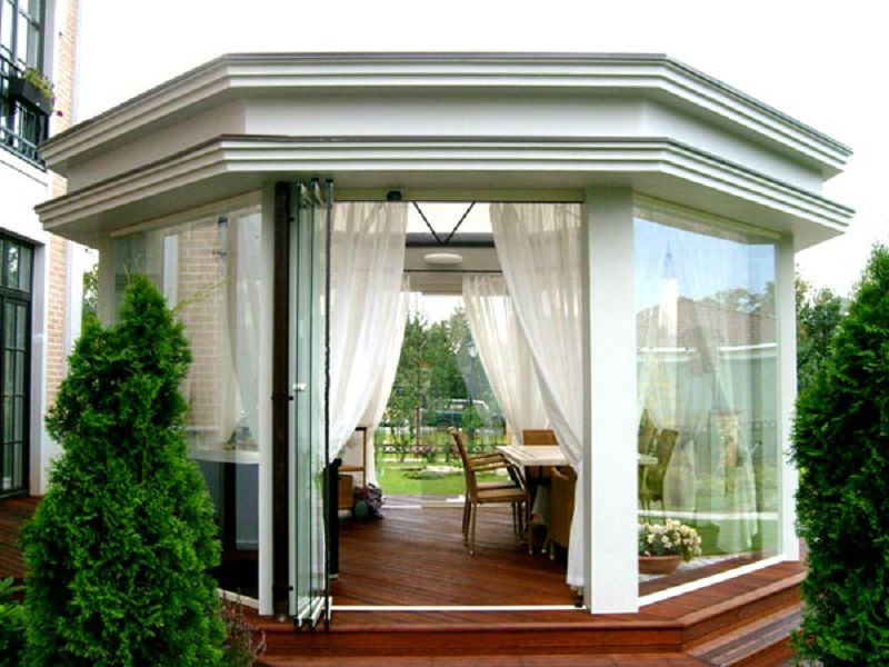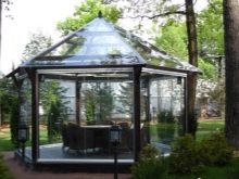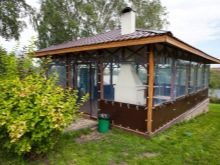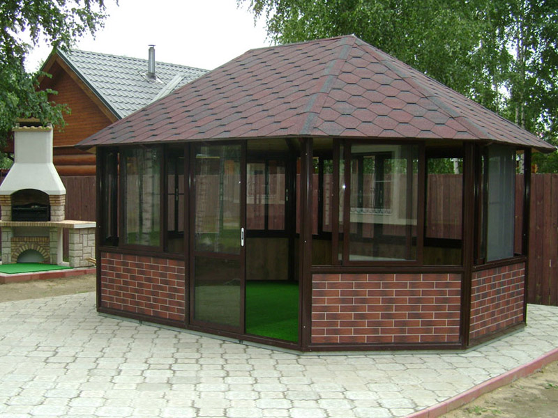 Ein geschlossener Pavillon ist ein Schmuckstück für jedes Vorstadtgebiet, wenn es in Übereinstimmung mit der Landschaft gemacht wird und dem Stil des Hauses selbst entspricht. Dies ist ein funktionelles und komfortables Element in der Umgebung.