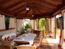 Nicht alle Projekte sind teuer. Wenn Sie möchten, können Sie Budget-Optionen für kleine Größen machen und das Design mit Accessoires und passenden Möbeln übertreffen. Zum Beispiel Sie können sogar den einfachsten überdachten Holzpavillon in ein Landhaus verwandeln. Dazu genügt es, die Flächen mit heller Farbe zu streichen, Vorhänge an die Fenster zu hängen und innen bequeme Korbmöbel einzubauen. Wenn es keine gibt, können Sie Textilabdeckungen auf den Rückseiten und den Sitzen nähen.