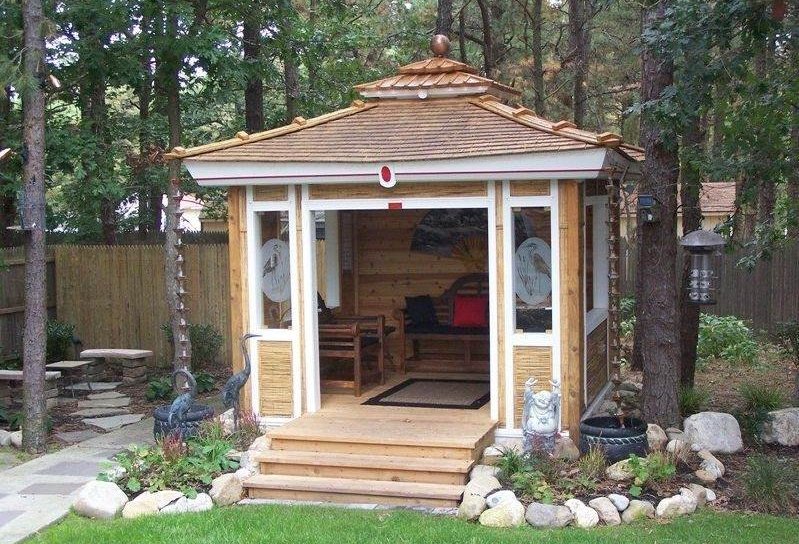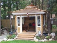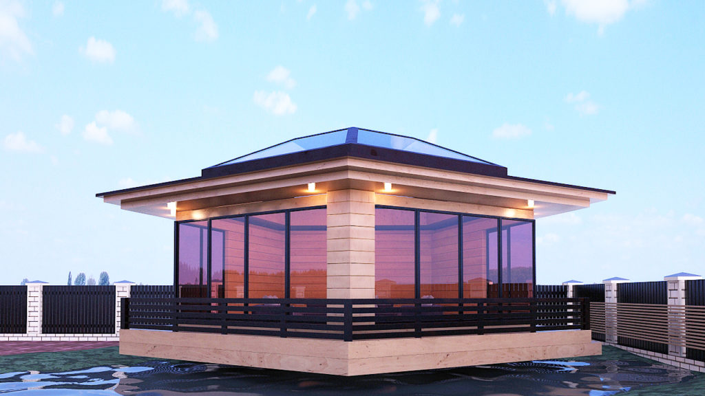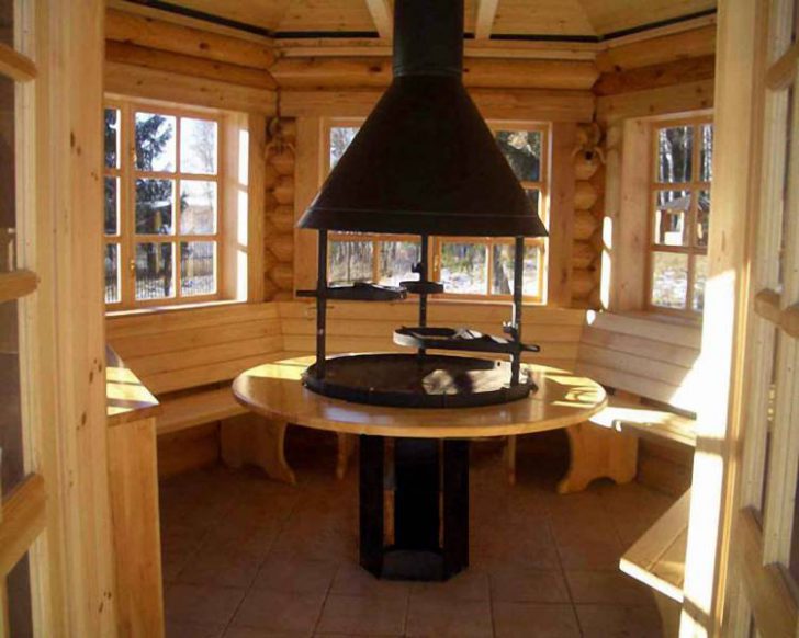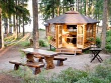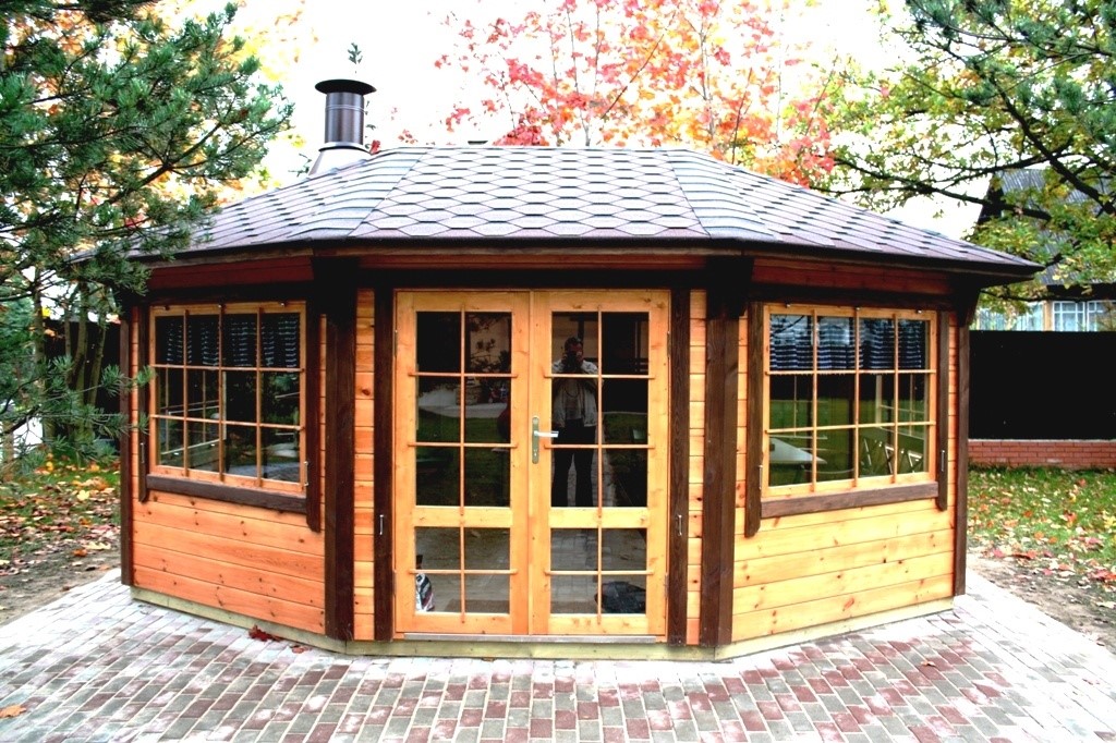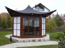 Ungewöhnliche Gestaltungsmöglichkeiten sind Pavillons im modernen Stil. Sie haben geräumige Fenster, sind aus massivem Holz, sowie Ziegel. Große Gebäude können eine komplexe Struktur des Daches haben, die durch Malerei und kreative Einrichtung erfolgreich von innen gespielt wird. Manchmal ähneln solche Pavillons den Jagdhäusern des Hofadels.Mit der richtigen Unterstützung der Innenelemente erlauben sie, den Komfort des Aufenthalts zu erhöhen.