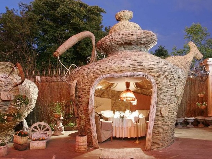 Eine ungewöhnliche Gestaltungsmöglichkeit ist die Altanka (Pavillon runde Form). In der Regel sind solche Einrichtungen klein, was es schwierig macht, Möbel anzuordnen, aber wenn Sie möchten, können Sie sie sogar in ein Blumengewächshaus verwandeln.