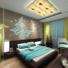 Schlafzimmer im avantgardistischen Stil, geeignet für junge kreative Menschen, bereit zu experimentieren. "Kombiniere das Unvereinbare" ist das Hauptmotto dieses Stils, der sich in den charakteristischen Farben widerspiegelt. Helle, saftige und rebellische Farben werden verwendet, um Wände, Decken, Möbel, Dekor und natürlich die Beleuchtung zu dekorieren.