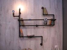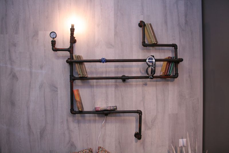 Die Beleuchtung in diesem Stil ist sehr wichtig, sie muss individuell und einzigartig sein. Dieses Foto zeigt eine benutzerdefinierte Nachttischlampe, die sofort Gegenstand der Beleuchtung ist, und ein Bücherregal. Alte verrostete Rohre, die als Grundlage dienen, erinnern an die Industrialisierung eines Raumes in der Vergangenheit, und eine einzelne Lampe lenkt die Aufmerksamkeit auf dieses Dekorelement.
