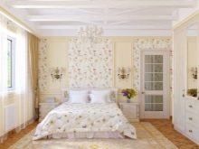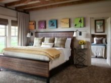 Dieser Stil wird meist mit Holzhäusern im Dorf und auf amerikanischen Ranches assoziiert. Das Konzept des Stils diktiert die Verwendung von Umweltmaterialien: Holz und Stein, voluminöse Tapeten und spezielle Leinwände. Dieses Schlafzimmer bietet eine warme, wohnliche Atmosphäre eines Landhauses.