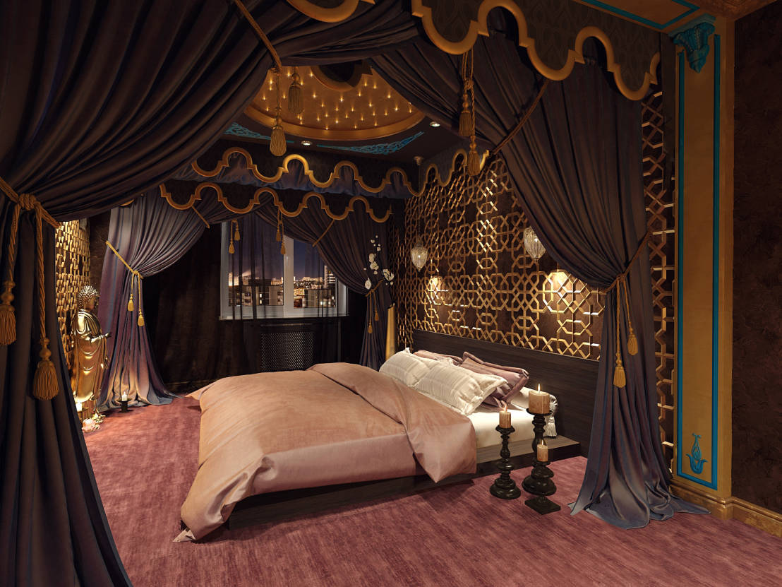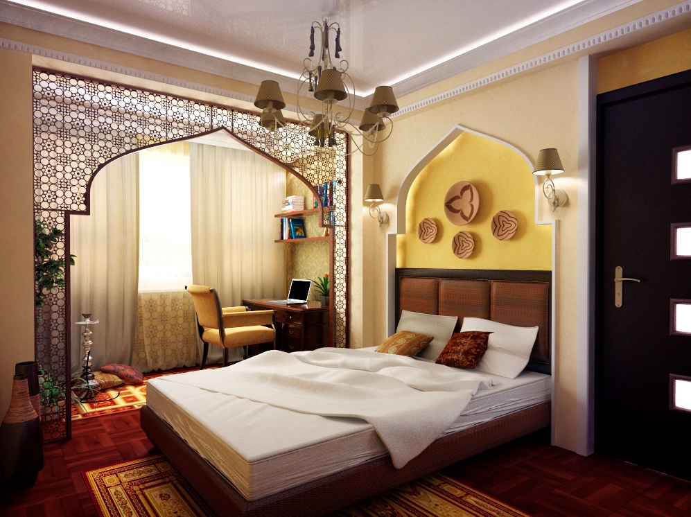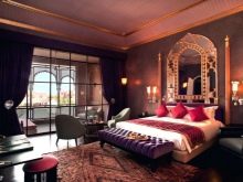 Ein solcher Raum sollte raffiniert und raffiniert sein und charakteristische Muster, glatte Linien und edle Farben kombinieren. Schlafzimmer im orientalischen Stil sollten mit Textilien übersättigt sein, mit teuren Stoffen dekoriert, farbenfroh und beeindruckend.