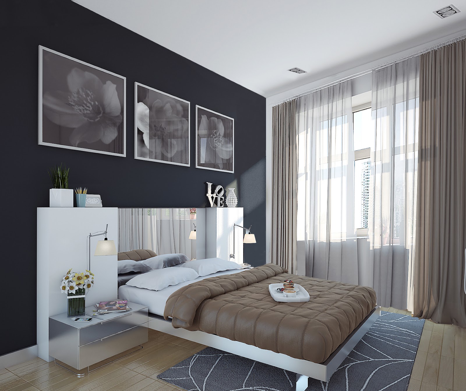 Einer der jüngsten Stile, der noch nicht 50 Jahre alt ist. Es zeichnet sich durch Funktionalität, Minimalismus und Geometrie aus. Das Schlafzimmer, das in diesem Stil eingerichtet ist, ist in der Regel hell, geräumig und nicht mit unnötigen Möbeln und dekorativen Elementen übersät. Besonderes Augenmerk wird auf die Gestaltung des Bettes gelegt. Normalerweise werden in seinem Kopfteil die wichtigsten Zeichen von Hi-Tech angezeigt - es kann ein Panel, ein Bild, ein Plasma-Fernseher oder eine Lampe sein.