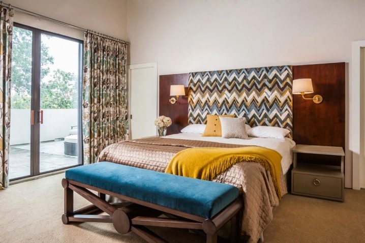 Solide flashy Lampen, die mit den Hauptfarben des Innenraums kontrastieren, würden eine große Lösung für ein Schlafzimmer sein, das in diesem Stil gemacht wird. Zum Beispiel, zylindrische grüne oder gelbe Modelle werden gut aussehen gegen eine rote Wand am Kopfende des Bettes, ergänzt das Gesamtbild und sorgt für die Helligkeit des Raumes.