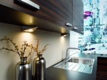 Aber von allen Regeln sind Ausnahmen. High-Tech-Stil ist streng und prägnant, aber auch darin gibt es verschiedene Dekorationen, zum Beispiel Strass. Wandlampen in verschiedenen Formen und Größen können mit großen und kleinen Steinen verziert werden, manchmal gibt es Dekorationen in Form von Kristalldekor. Aber vergessen Sie in diesem Fall nicht, dass die Zusätze nicht groß und zu elegant sein sollten.
