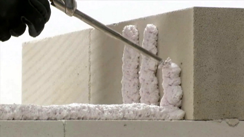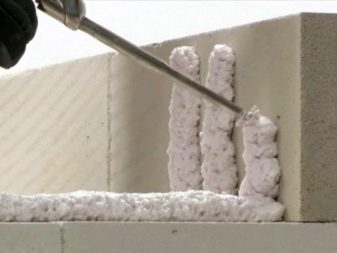 - Auf Betonsteinen wird in einem Streifen in der Mitte nicht mehr als 115 mm dicker Schaum aufgetragen. Wenn die Dicke der Wände größer ist, dann ist es notwendig, zwei parallele Streifen zu verwenden, die von den Kanten von 3-5 cm abweichen.Gleiches gilt für die Verwendung von Schaum in Mauerwerk.