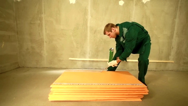 - Auf Gipsplatten wird die Zusammensetzung von innen durch Streifen mit einem Abstand von 15 cm und einem Abstand vom Ende von 5 cm aufgetragen, danach wird die Platte fest an die Oberfläche gepresst und 3 Minuten gehalten.