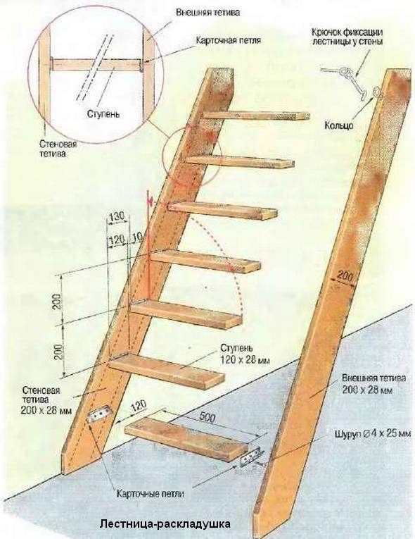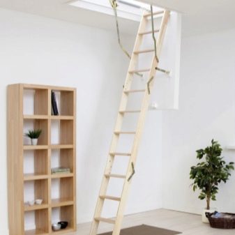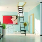 Der faltbare Dachbodenentwurf unterscheidet sich vollständig von vorherigen Typen. Sie versteckt sich nicht in der Luke und wirkt manchmal sogar als zusätzliches Stück Innenausstattung. Zu den Vorteilen gehört eine Art der Montage an der Wand.Im zusammengeklappten Zustand ähnelt es einer vertikalen Feuerleiter. Zerlegt wird es zu einem Standard-Marsch-Design mit einem Abhebewinkel von nicht mehr als 45 Grad.