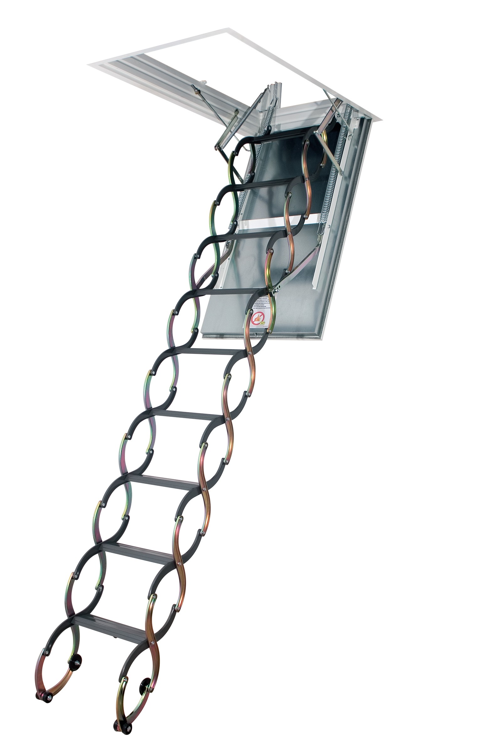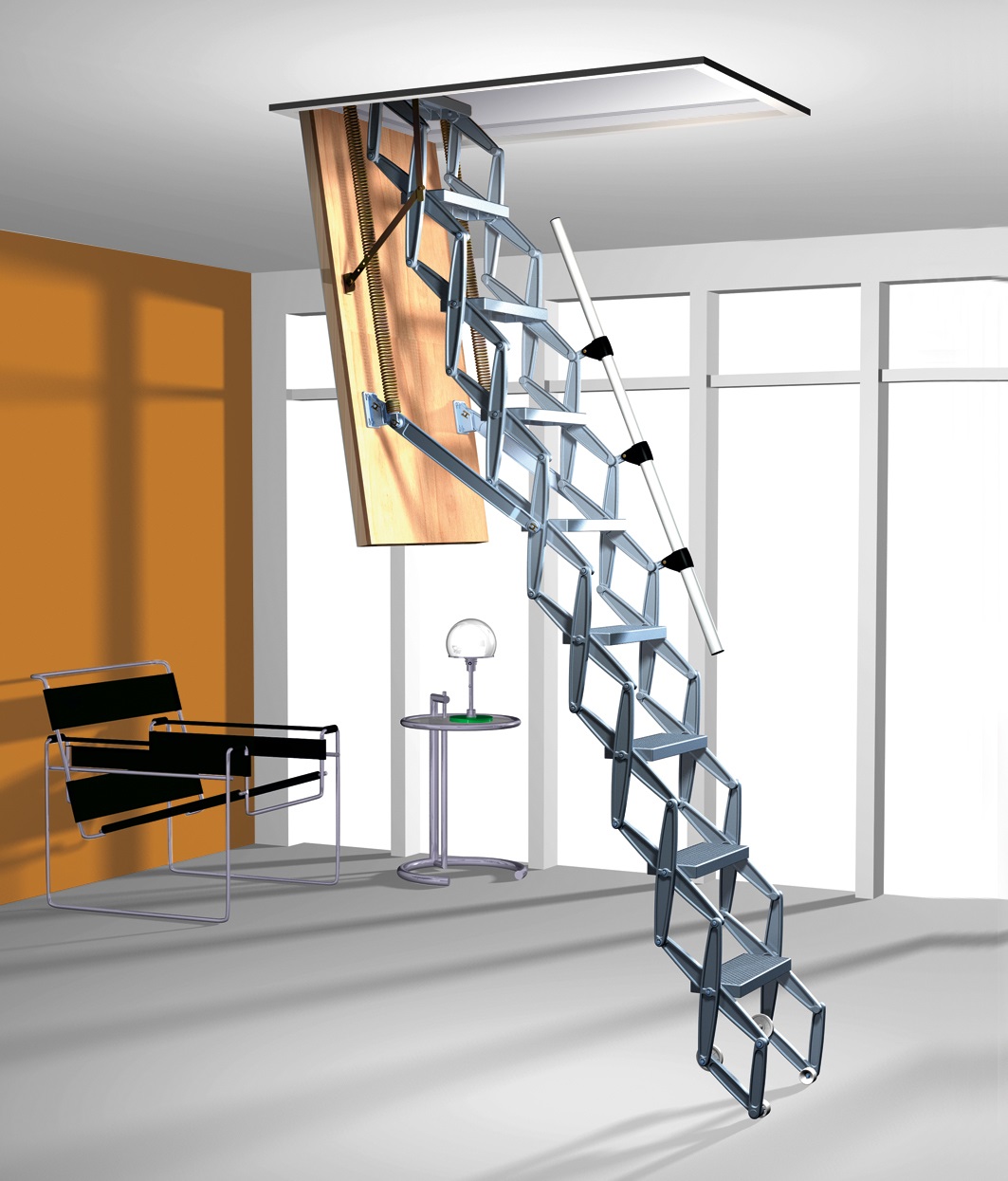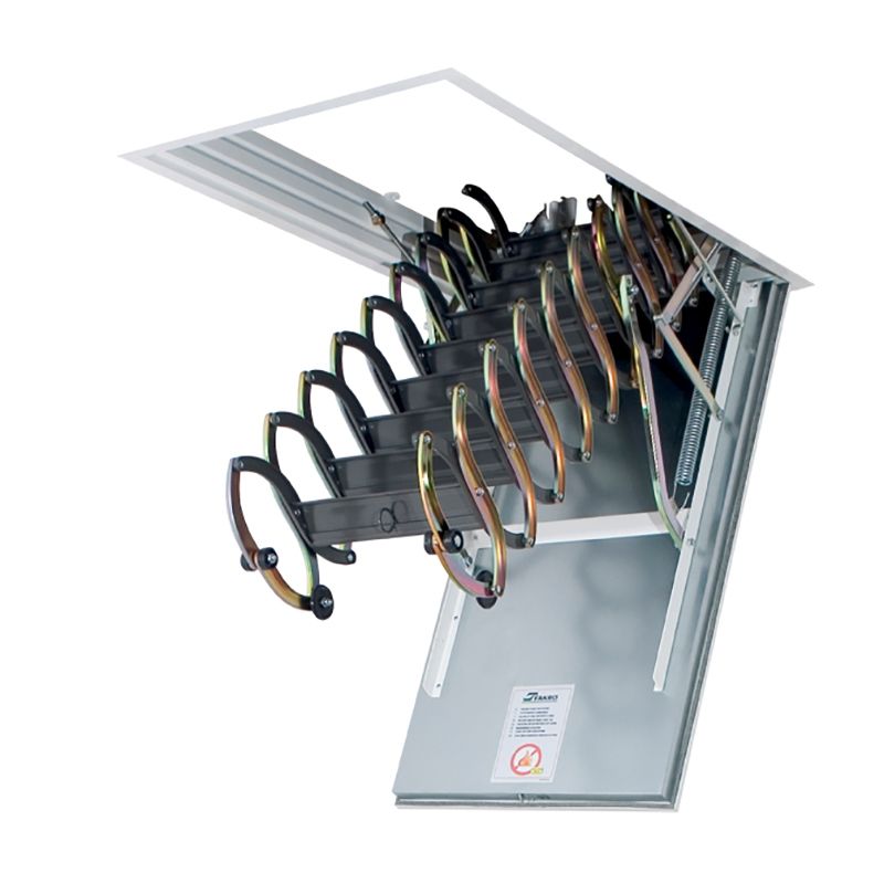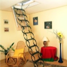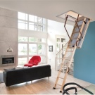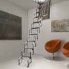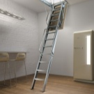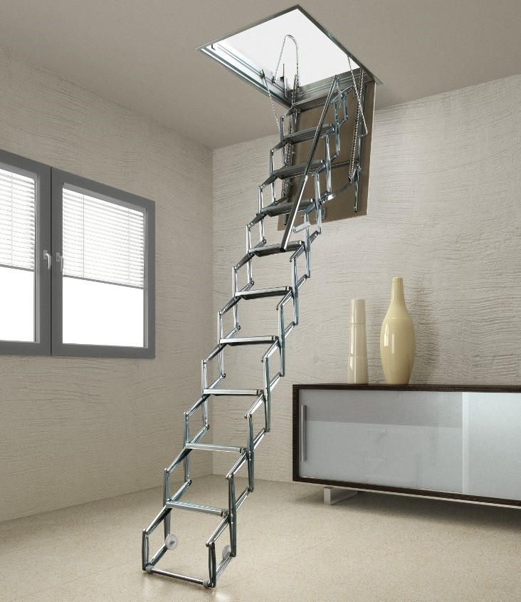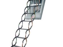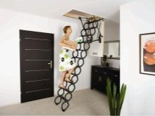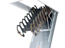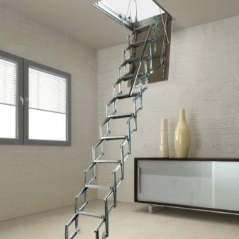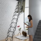 Attische Treppen mit einer Scherenmechanik haben sehr kompakte Abmessungen, sind bequem in der Luke montiert, widerstehen einer maximalen Belastung von 150 kg. Sie sind sehr stark und langlebig, manchmal mit Klappgeländer ausgestattet.